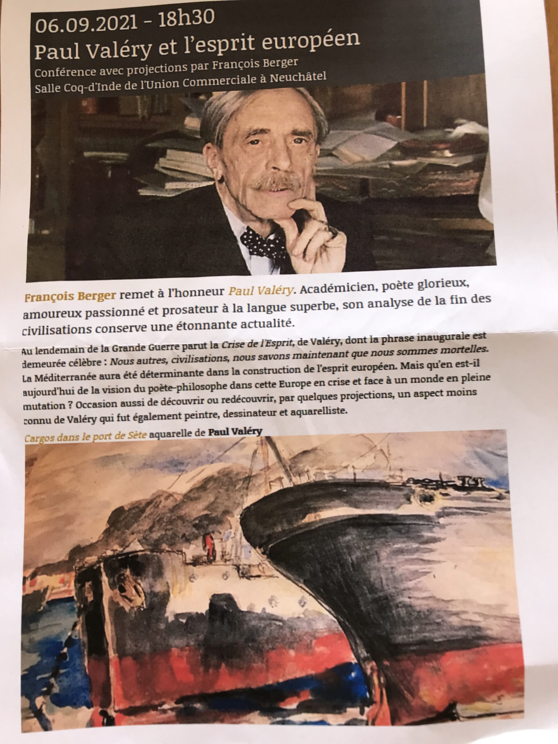 3- Et enfin, pour celles et ceux qui auraient manqué la conférence de Me François Berger que nous avons organisée fin 2019 sur Paul Valéry et l’Europe, nous vous informons de la possibilité de la suivre une nouvelle fois très prochainement! Le lien ci-bas vous fournit toutes les informations utiles.
